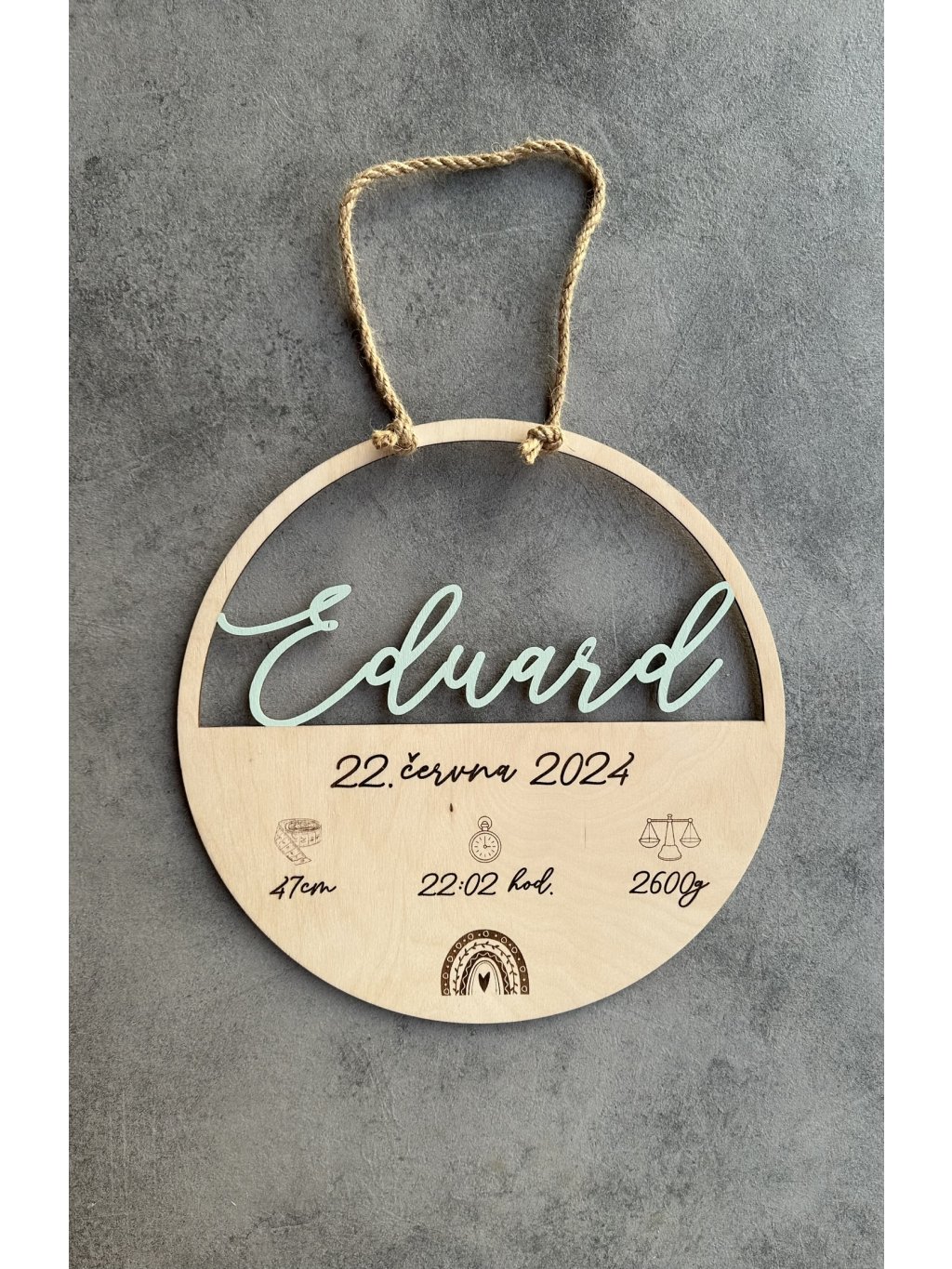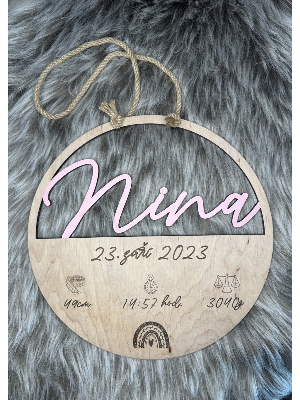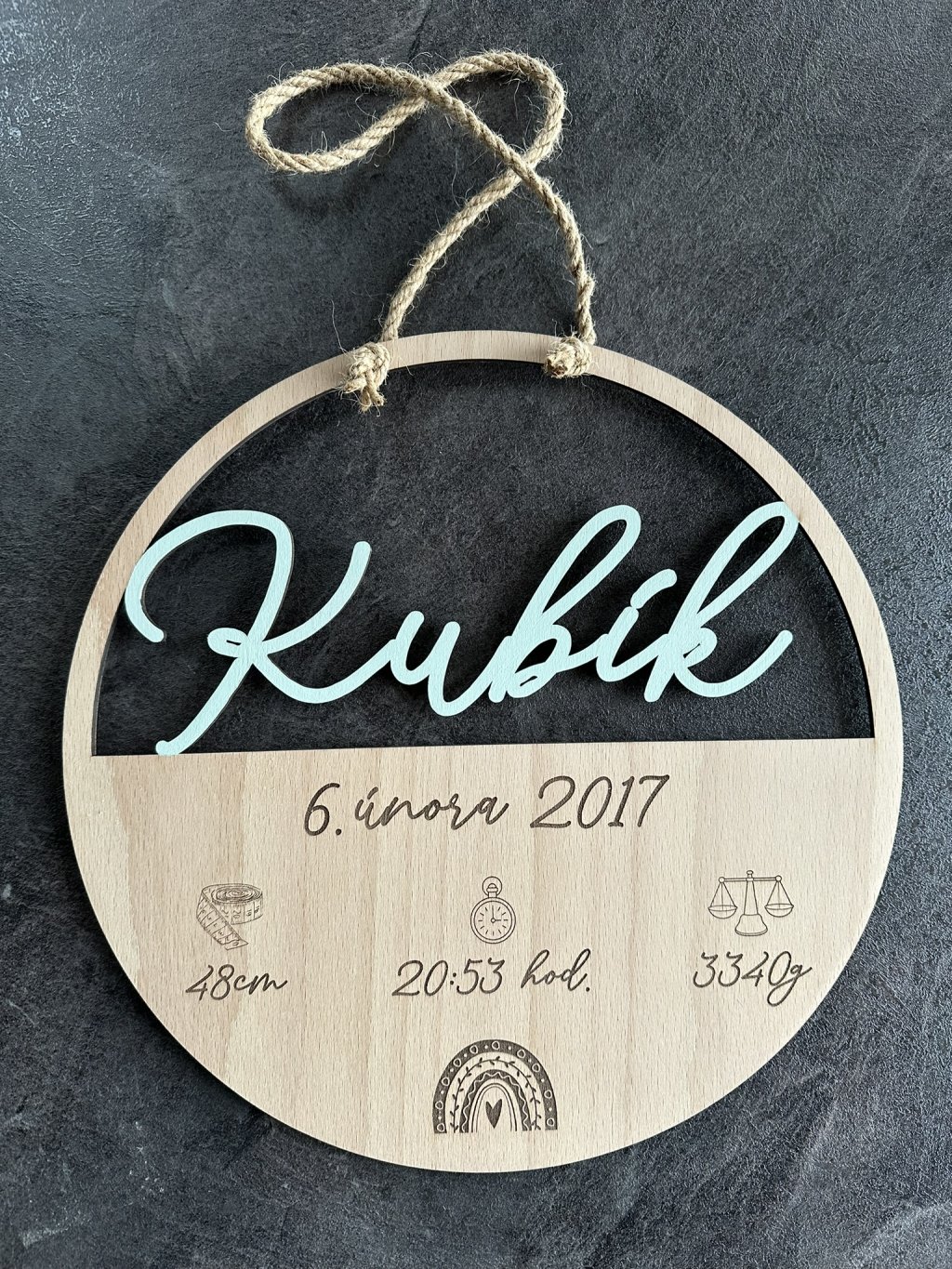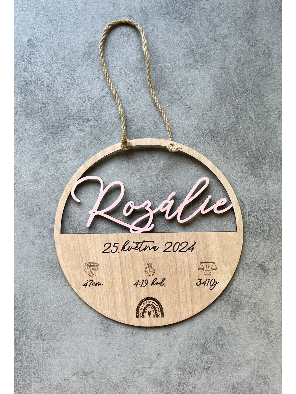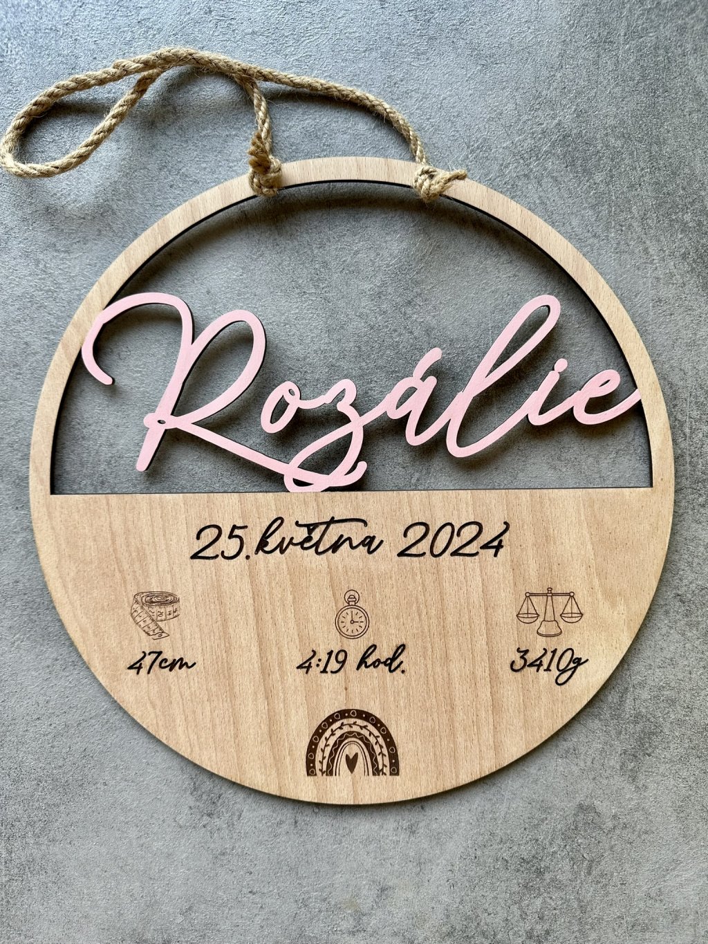 Kulatá dřevěná cedulka se jménem miminka a údaji o narození – čas, váha, výška. Možnost přírodního nebo barevného jména.