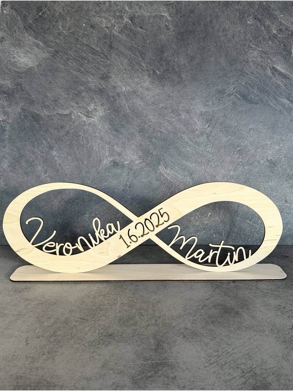 Dekorace ve tvaru nekonečna se jmény novomanželů a datem svatby. Stylový a osobní doplněk svatebního stolu nebo památka na váš den.