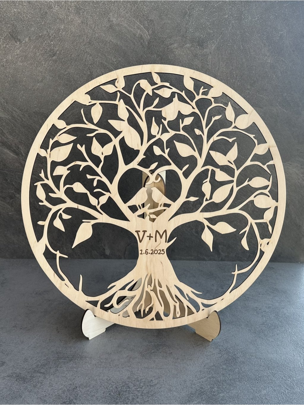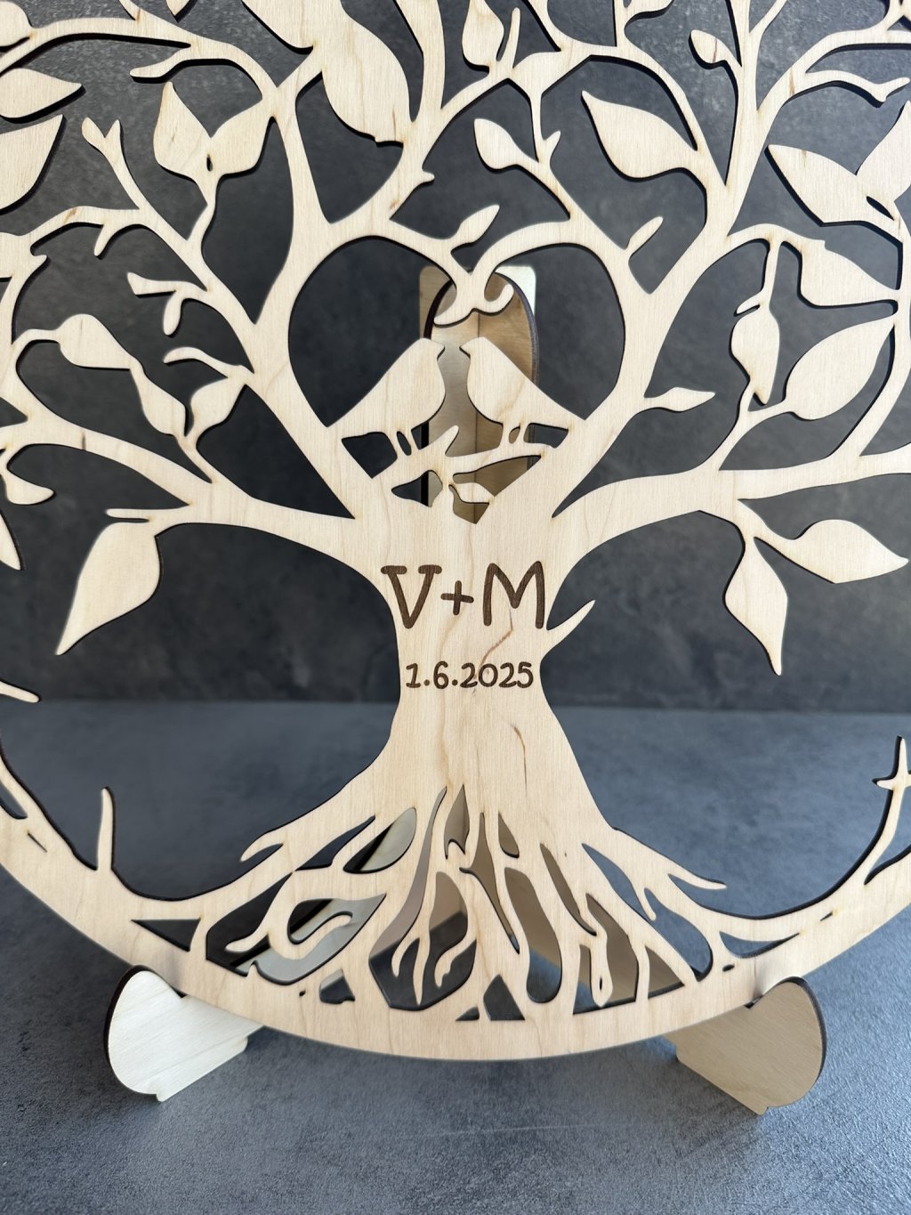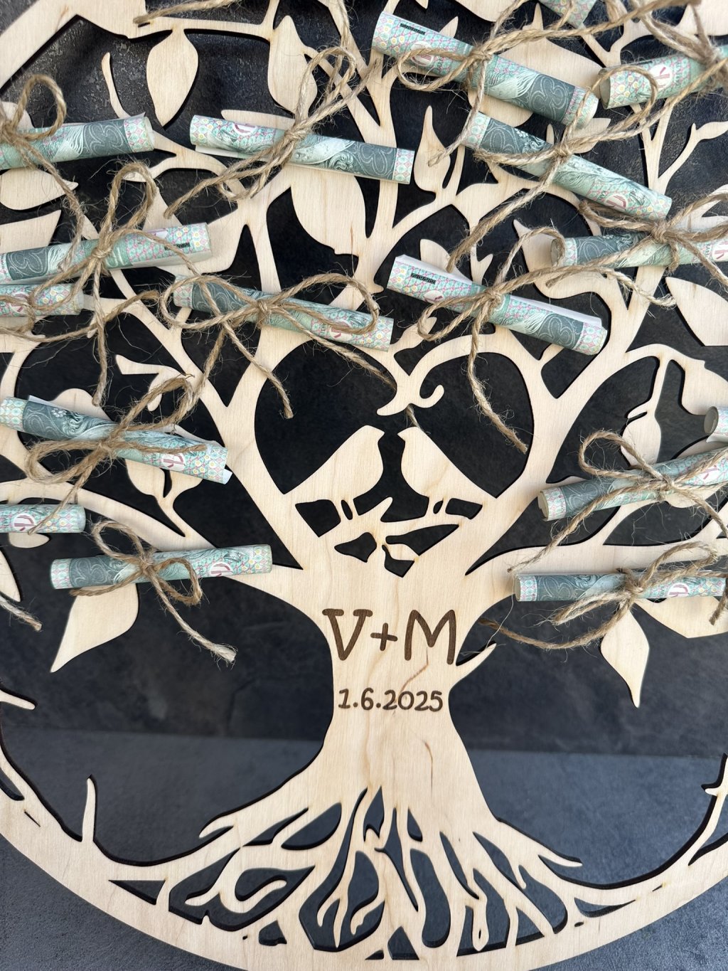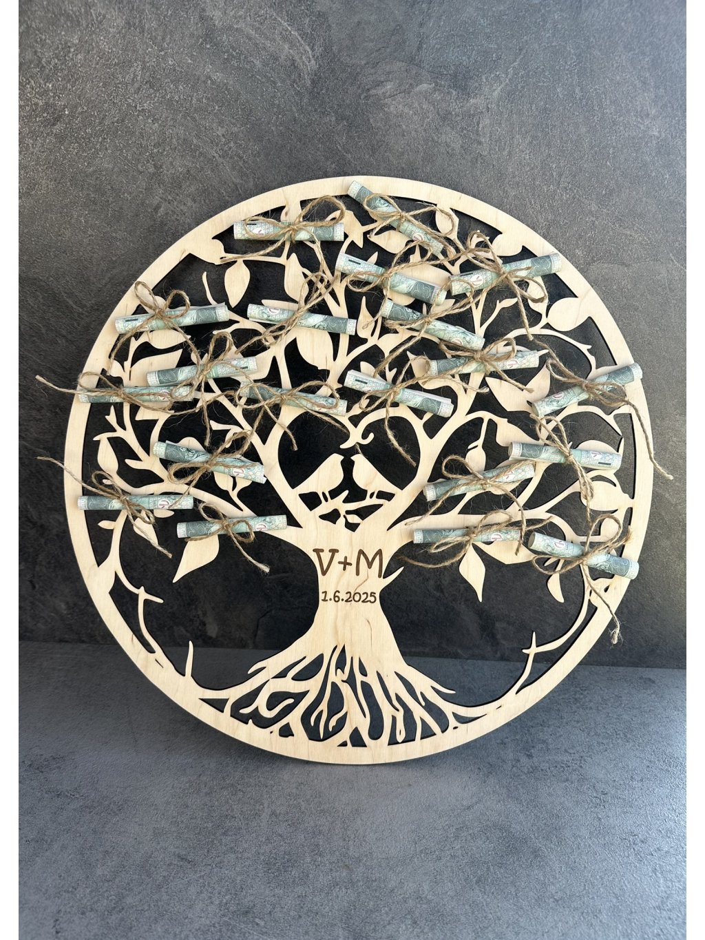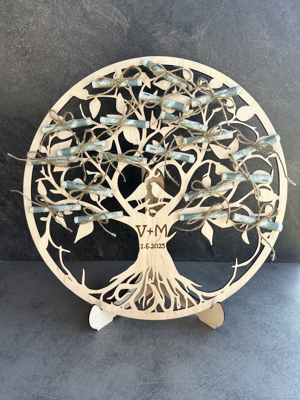 Jedinečný a symbolický svatební dar, který zaujme na první pohled. Tento dřevěný Strom života z kvalitní překližky můžete věnovat jako dekoraci samostatně, nebo jej využít jako kreativní způsob, jak novomanželům předat finanční dar – na jednotlivé větve lze jednoduše zavěsit bankovky.