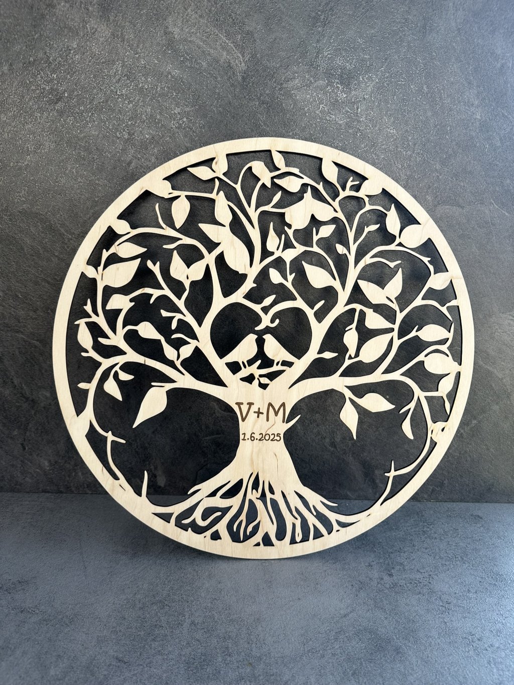 Dřevěný Strom života z překližky s iniciály snoubenců– originální svatební dekorace, kterou můžete darovat samostatně nebo využít jako netradiční způsob předání peněz. K zavěšení nebo se stojánkem.
