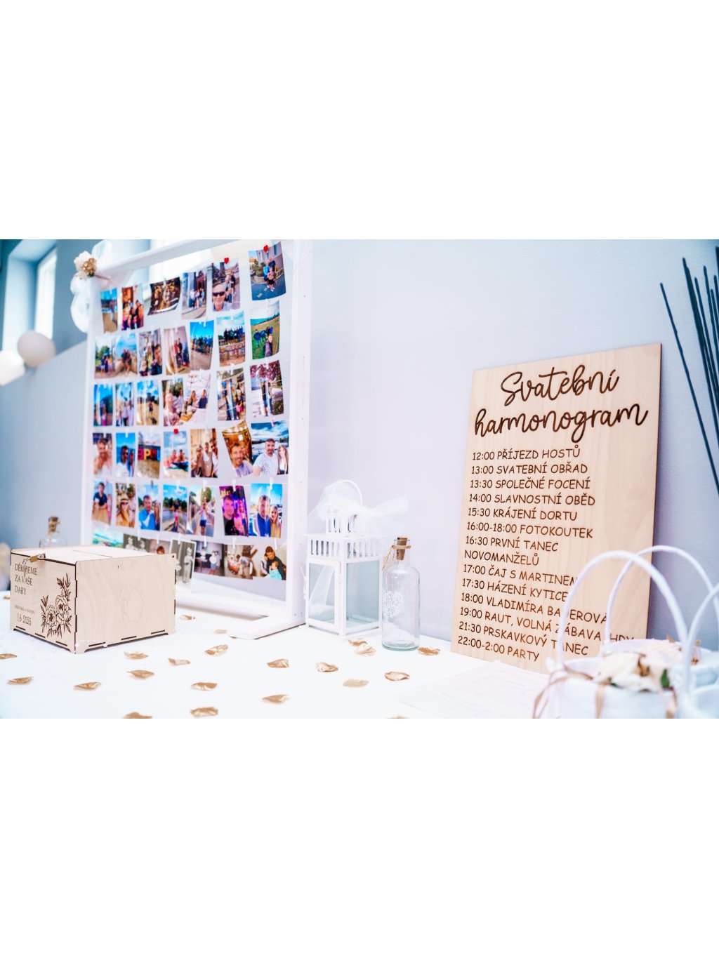Chcete, aby vaši hosté přesně věděli, co je během svatebního dne čeká? Svatební harmonogram je krásný a praktický prvek výzdoby, který přehledně informuje o programu dne – od obřadu přes focení až po večerní zábavu.