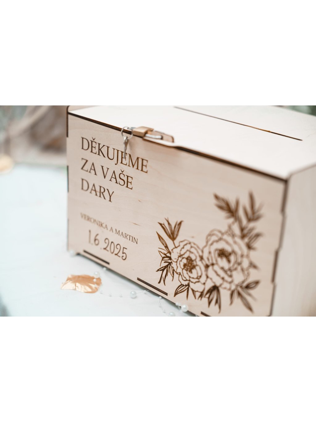 Elegantní dřevěná truhla pro svatební dary, obálky nebo přání. Stylový doplněk na svatební stůl, který podtrhne atmosféru vašeho dne.