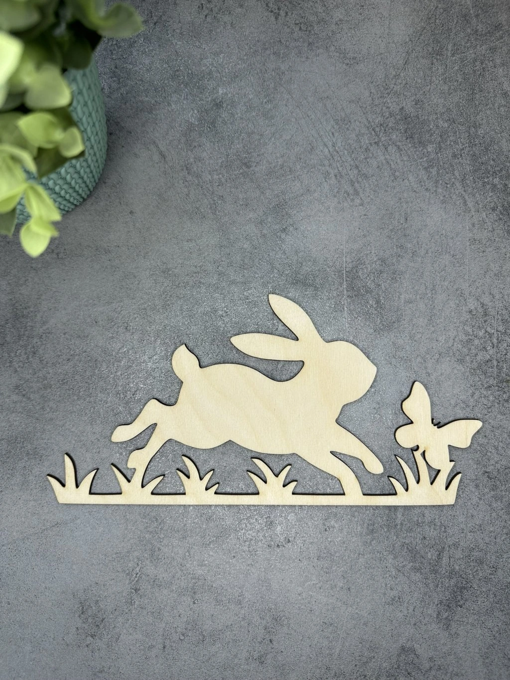 Dřevěný výřez běžícího zajíce. Ideální polotovar pro výrobu jarních a velikonočních dekorací.