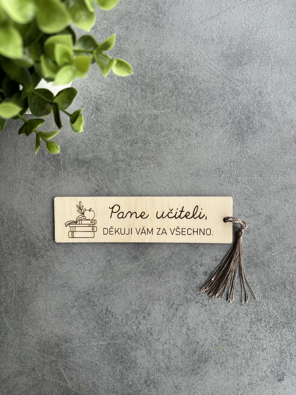 Dřevěná záložka do knihy s třásní – originální dárek pro pana učitele, asistenta, vychovatele, kuchaře či ředitele. Výběr orientace textu, barva třásně náhodná.